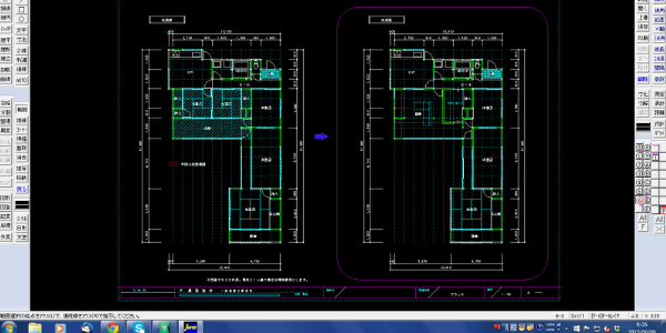 私たちの仕事には、欠かせないCAD(キャド)。昔は、製図台を使って、手で描いていました。今の季節、湿度が高かったりすると紙(トレッシングペーパー)が水分を含んで、しわしわになったり、鉛筆ののりが悪かったりしました。CADに変わり、季節の苦労はなくなりましたね。弊社では、JW_CAD というフリーのソフトを使っています。長い間、いろいろなソフトを試していたのですが、軽快な操作性とどんなことにでも対応できる融通性の良さ、外部の取引先との互換性の良さなどで、ここ10数年はずっとこのソフトを使っています。