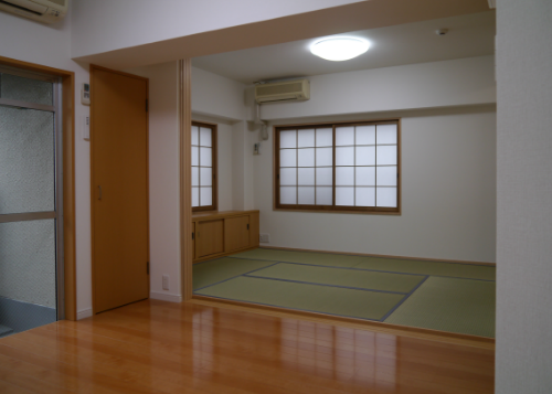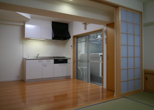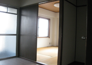 今回は、躯体(コンクリート部分)以外はすべて解体・撤去しました。当然、トップの写真であるように給水管やガス管などの部屋内の配管もすべてを取り替えました。プランでいうと2DKから1LDK+Sへの変更で、部屋の広さを感じれるように建具で部屋を間仕切るようにしました。3枚の建具を壁に引き込むと大きなひと部屋になります。また、写真で見れる畳の下はフローリングで、畳でもいいし、フローリングでも使えると入居者が選べるようになっています。障子の枠や骨組み、クーラーなど使えるものはそのまま残しています。