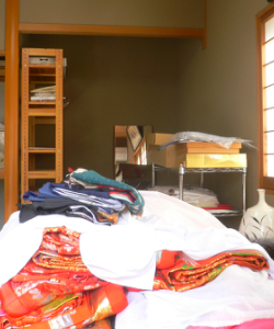 たくさんの着物を一目で識別できるように大きめの収納をつくりました。収納スペースの両サイドに棚を設置。可動棚ですので、大きさを合わせて収納の高さを変えることができます。