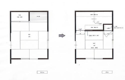 そのご自宅の一室を着付け室にリフォームしました。たくさんの和服があり、お客様が来られるたびに必要なものとそうでないものを整理されていたそうです。今回のリフォームでは、そのたくさんの衣装を収納するスペースと着付けスペースをすっきり分け、それをデザイン的に処理することでした。