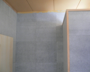 左の写真は、衣装の収納スペースの下地の写真です。パネルは、竹炭のパネルで、防湿効果のある部材です。断熱材の入っていなかったところにも今回の工事をきっかけに断熱材を追加しています。