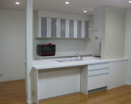 とにかく、明るいお部屋にしたいとの奥様よりの要望がありましたので、キッチンの面材の色や仕上の色など明るく仕上ました。床の張替え、照明を新たに設置するなどの工事も行いました。