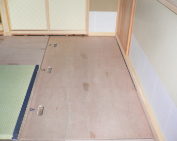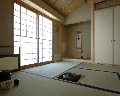 茶道は、道具を置く位置や足の運びが畳の目を目安にしています。通常、マンションの和室の場合畳のサイズがかなり小さいんですよね。そこで、和室6帖あったところを4畳半にし、炉を設置するために床を20cmほどあげました。炉を置くところ以外は床下収納ができるようなっています。余ったスペースには置き水屋が設置できるように物入を設けました。その他、畳の目の方向や釘の位置など流派によっても違いがあることなどこの物件を通してかなり勉強になりました。