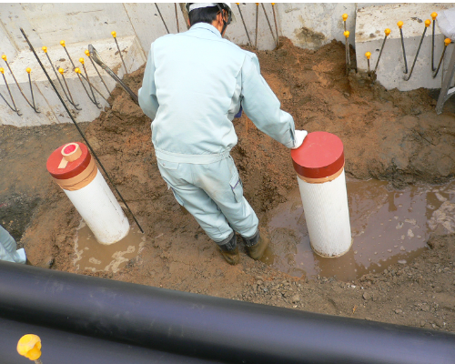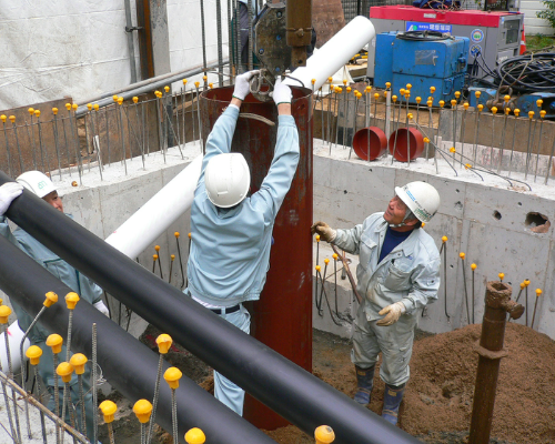 弊社事務所ビルでは、冷暖房の補助として地中熱を利用した冷暖房システムを導入しております。