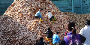 子供たちが楽しそうに遊んでいます。これは、先月行った森林ツアーでのひとこまです。場所は福岡市森林組合の製材所。福岡(特に脊振山系)の山林で切られた木材は、こちらに運び込まれて製材されます。